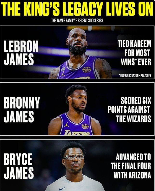 与此同时,詹姆斯的两个儿子也传来捷报:大儿子布朗尼在湖人对阵奇才的比赛中登场,拿到6分,在 NBA 赛场稳步成长;小儿子布莱斯则跟随亚利桑那大学晋级 NCAA 最终四强,在大学赛场打出亮眼表现。对此,美媒专门发图庆祝。